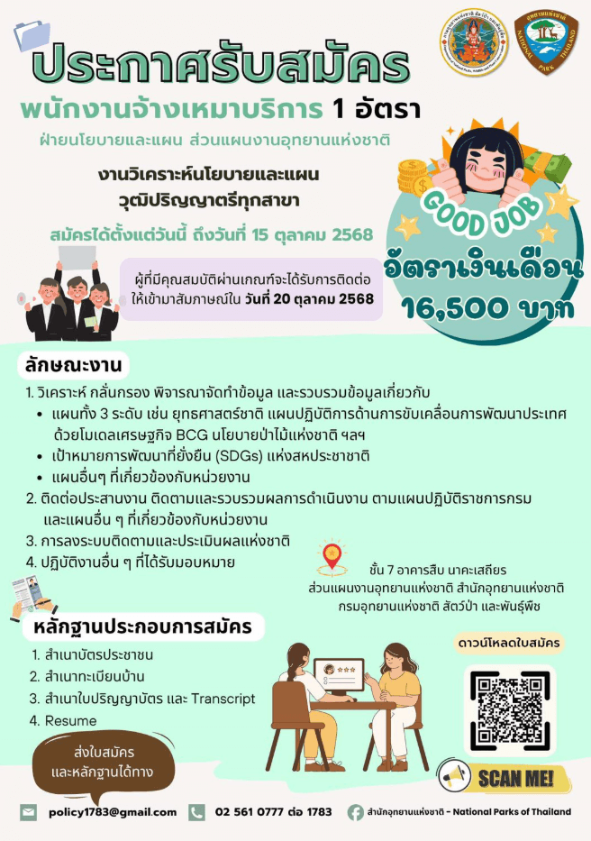 กรมอุทยานแห่งชาติ สัตว์ป่า และพันธุ์พืช เปิดรับสมัครงาน ป.ตรี ทุกสาขา / เงินเดือน 16500 / ไม่ต้องผ่านกพ. สมัคร – 15 ตุลาคม 2568