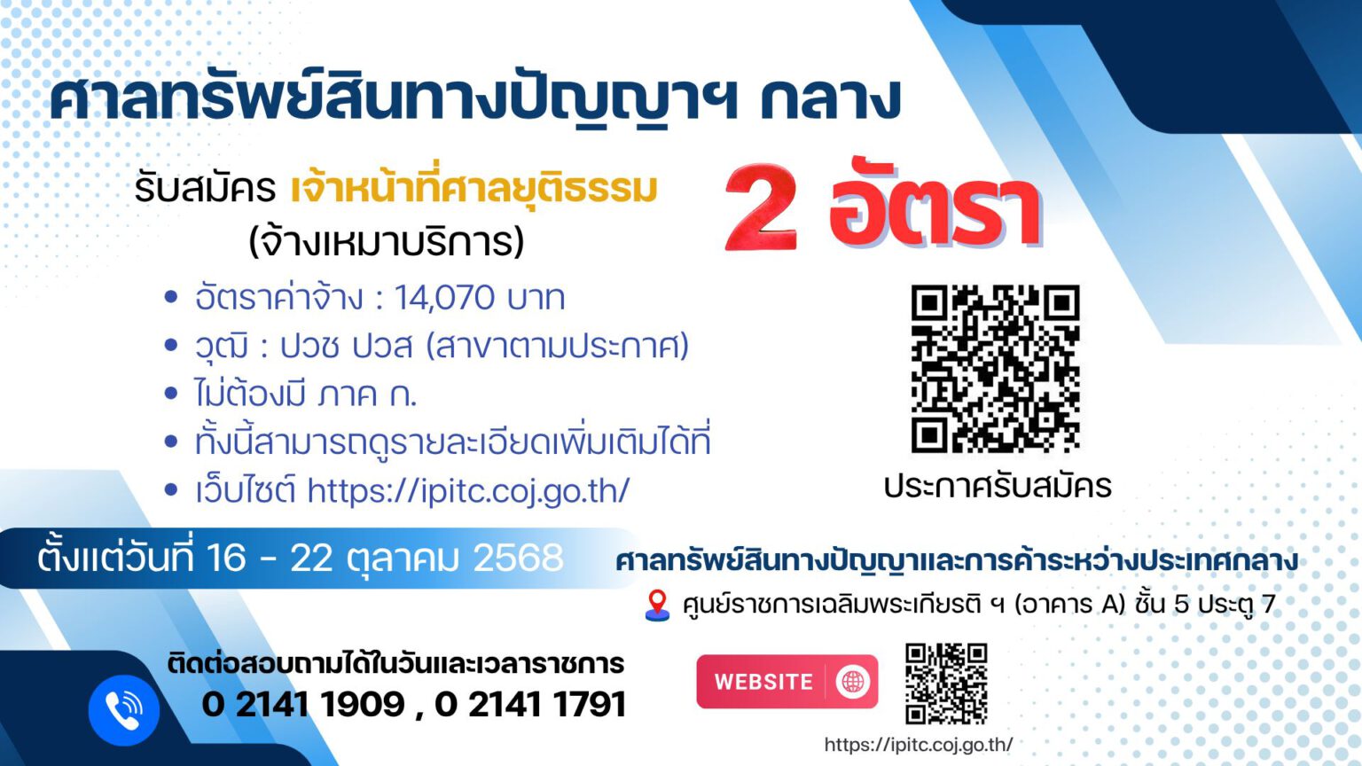 ศาลทรัพย์สินทางปัญญาและการค้าระหว่างประเทศกลาง เปิดรับสมัครงาน เจ้าหน้าที่ศาลยุติธรรม สมัคร 16 – 22 ตุลาคม 2568