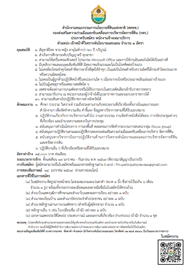 สำนักงานคณะกรรมการนโยบายที่ดินแห่งชาติ (สคทช.) เปิดรับสมัครพนักงานจ้างเหมาบริการ 1 อัตรา รับสมัครทาง E- mail ตั้งแต่ตั้งแต่บัดนี้ – 12 มกราคม 2569